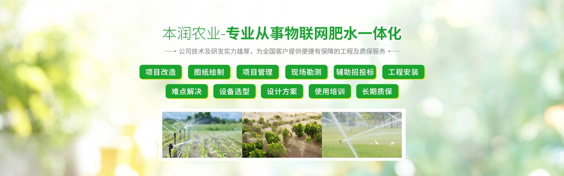 公司作為中國西南節(jié)水領域中的先導企業(yè),設備先進,技術力量雄厚,擁有一套可開放對接的農業(yè)物聯(lián)網采集、控制、管理平臺。同時公司擁有屬于自己的科研開發(fā)團隊,每年都有適合市場需求的新產品適時推出更新,我司專業(yè)的灌溉設計團隊都擁有多年的施工經驗可出標準CAD圖紙及設計方案說明,能為客戶提供施工前后對比照,施工日志等資料,輔助政府需要的資料整理等。總之本潤灌溉本著用心的原則,完全可以作為您節(jié)水灌溉工程材料采購、項目施工、項目設計的灌溉服務式一站式平臺。